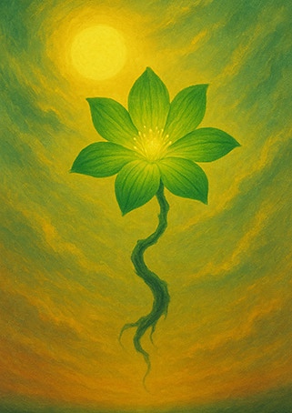 A green blossom grows on the rootless tree.Evergreen pines and bamboo thrive through all seasons.Cold winds sting, fierce sun scorches, yet Qi renews each day, powering the Way.