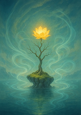 黄色い花は中央(土)に属し、安定と統合を象徴します。根のない不安定な木にあっても、内なる重心が整っていることを示します。